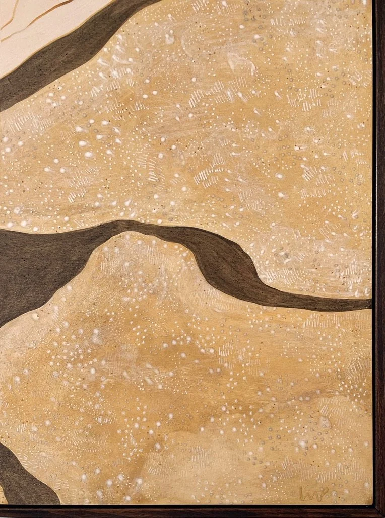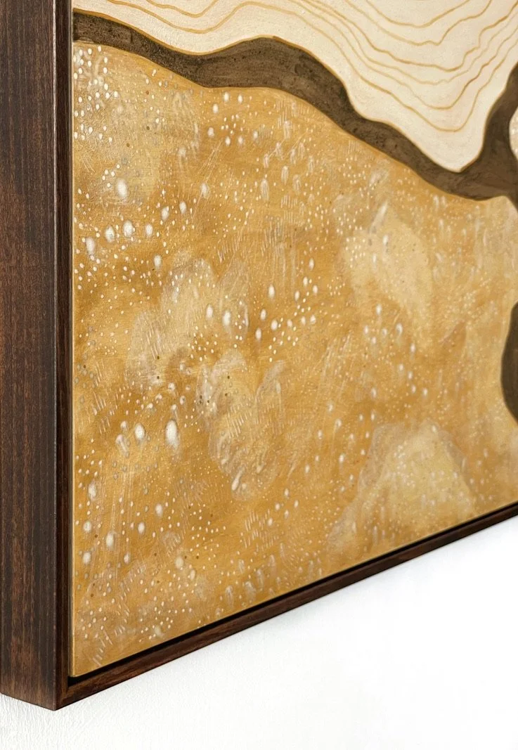 A Matter of Perspective is made using pigment from rocks foraged in the UK by Lisa. Using a combination of white chalk from Hampshire, mica from the Isle of Mull, black sea coal from Kintra and yellow sandstone from Fife on beautiful birch plywood.